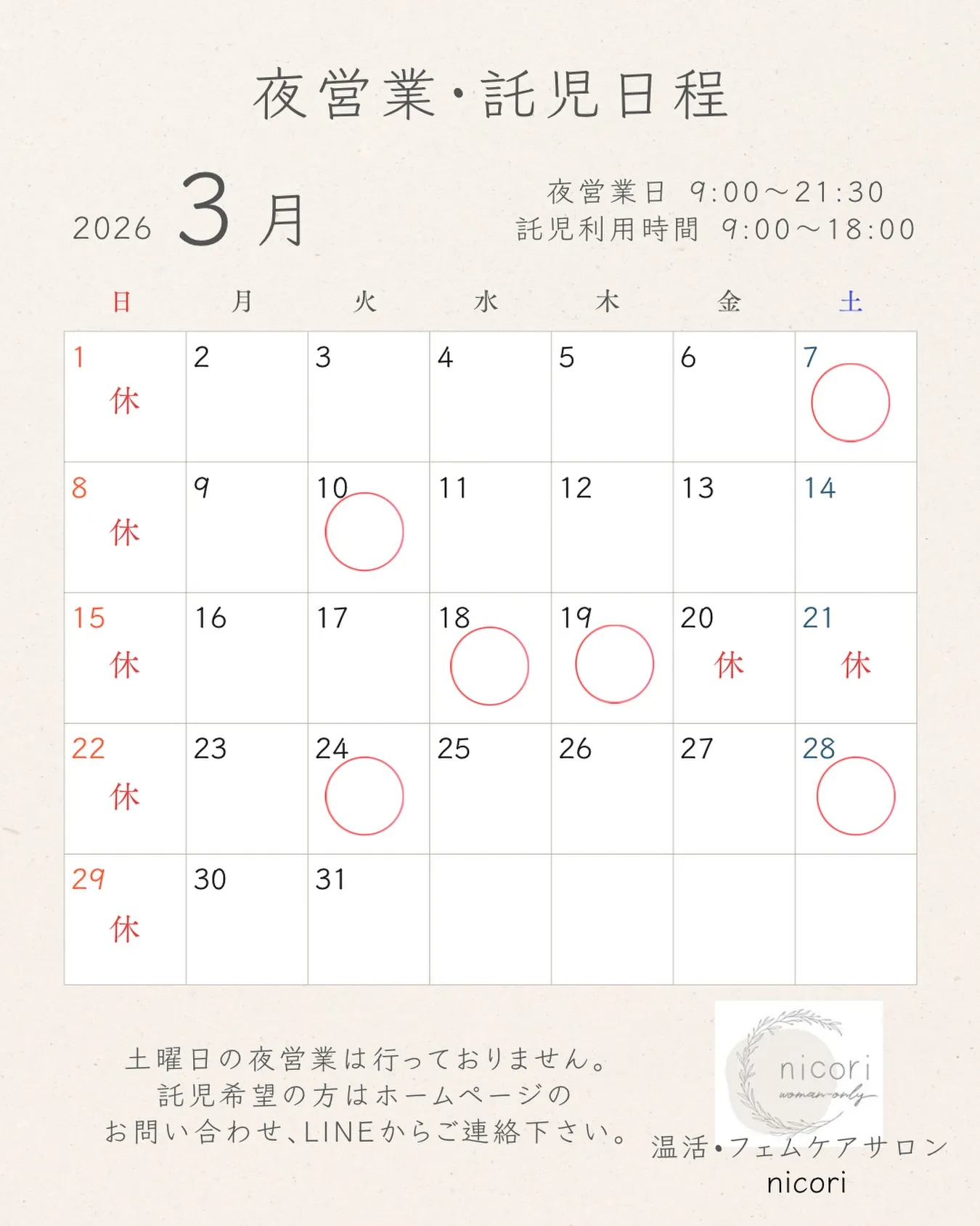 🌸3月 夜営業&託児日程のお知らせ🌸